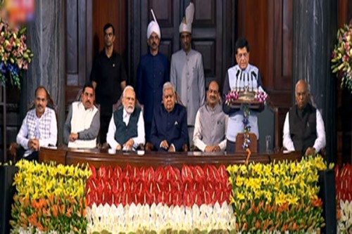 Vice president Jagdeep Dhankhar, Lok Sabha Speaker Om Birla, Prime Minister Narendra Modi, leader of Congress in Lok Sabha Adhir Ranjan Chowdhury, leader of opposition in Rajya Sabha Mallikarjun Kharge, leader of Rajya Sabha Piyush Goyal and Parliamentary affairs Minister Pralhad Joshi were seated on the dias in Central Hall.