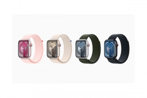 Apple Watch Series 9 is available in 41mm and 45mm sizes in starlight, midnight, silver, (PRODUCT)RED, and a new pink aluminium case, as well as stainless steel in gold, silver, and graphite cases — along with new Sport Loop band.