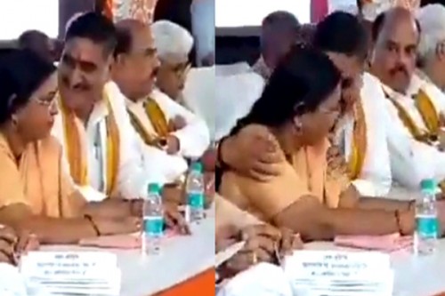 In the video, Gautam has been captured on camera, placing his hands on the shoulders of the woman MLA while they were both on stage.