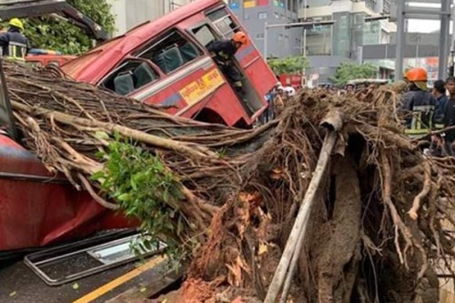 According to the police, 17 passengers were rushed to the hospital, but it took nearly an hour to rescue two who were stuck inside the bus that was crushed by the tree.