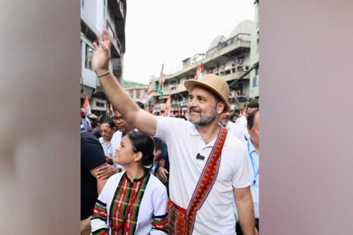 Immediately after his arrival, the Congress MP participated in a padyatra from the state capital's Chanmari area to the Raj Bhawan.