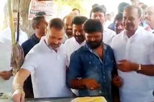 Jagtial (Telangana), Oct 20 (IANS) Congress leader Rahul Gandhi tried his hand at making a dosa at a roadside eatery in Telangana’s Jagtial district on Friday.