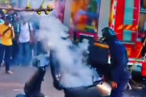The video shows heavy smoke coming out of a scooter while the fire brigade team uses a water hose to control it.