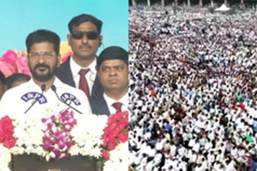 Revanth Reddy arrived in the stadium with Congress leader Sonia Gandhi, standing in a decorated open vehicle.