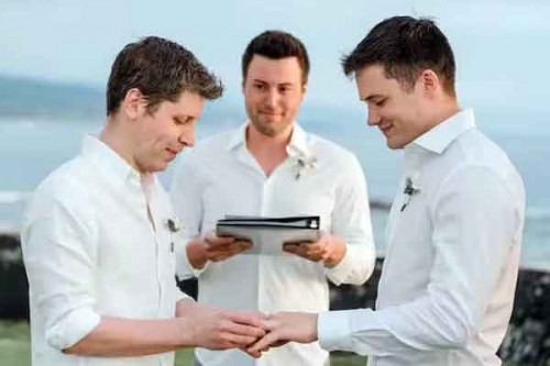 The pictures capture the couple exchanging vows on a beach, surrounded by palm trees and a group of about a dozen guests.