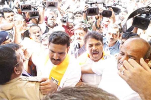 Bengaluru, Feb 7 (IANS) Karnataka BJP unit on Wednesday staged a protest demonstration against Congress ‘Chalo Delhi programme and tried to barge inside the Congress office in Belagavi city.