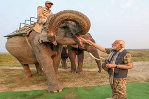 Guwahati, March 9 (IANS) Prime Minister Narendra Modi rode on an elephant ‘Pradyumna’ for a safari in the Kaziranga National Park and Tiger Reserve in Assam on Saturday. He also went on a jeep safari and visited Daflang Tower in the park.