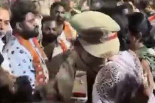 The police officer in uniform was on duty when the BJP leader was campaigning in an area under the limits of Saidabad Police Station.