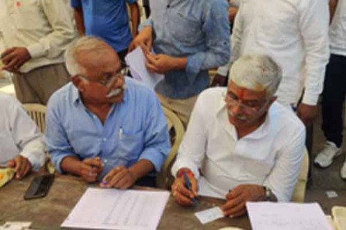 After exercising his franchise, Minister Shekhawat reached the booth counter near the school and got busy making voters' slips as he is also the Panna Pramukh of his booth.