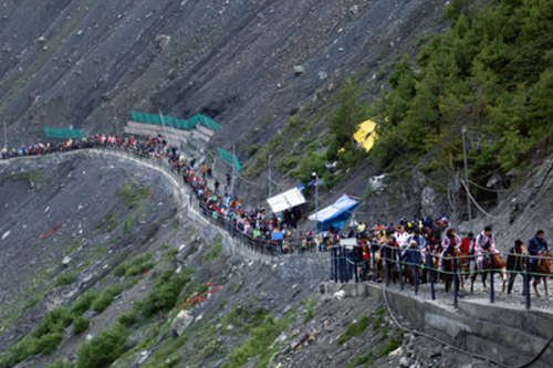 Yatris use either the shorter north Kashmir Baltal base camp route or the traditional longer south Kashmir Pahalgam route to reach the Holy cave situated 3888 metres above sea level in the Kashmir Himalayas.