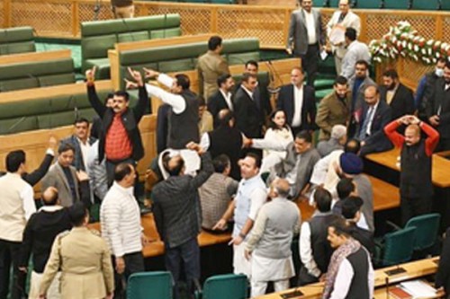 Speaker Abdul Rahim Rather tried to calm tempers, but after his repeated attempts failed to quell the pandemonium, he adjoined the House for 15 minutes.