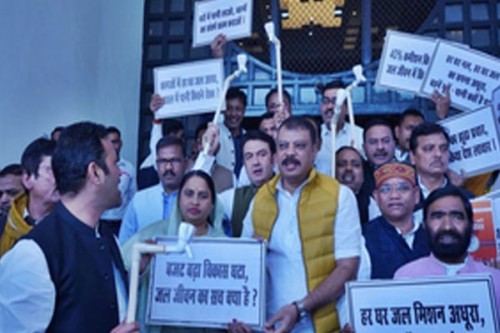 Bhopal, Dec 19 (IANS) Congress MLAs in Madhya Pradesh on Thursday staged a protest on the premises of the Assembly complex here against the Mohan Yadav government accusing it of irregularities in the implementation of the 'Nal Jal' scheme in the state.
