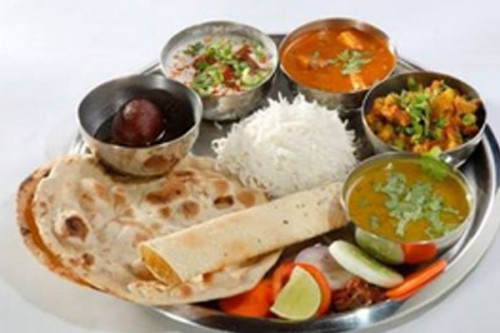 A veg thali comprises roti, vegetables (onion, tomato and potato), rice, dal, curd and salad. A non-veg thali has the same elements except for dal, which is replaced by chicken (broiler).