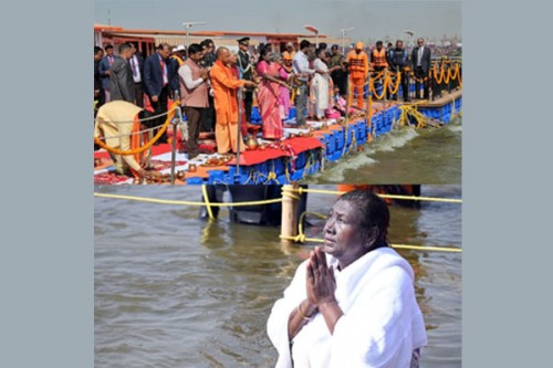 New Delhi, Feb 10 (IANS) President Droupadi Murmu visited Prayagraj on Monday to take part in the ongoing Maha Kumbh Mela, where she took a sacred dip at the Triveni Sangam.