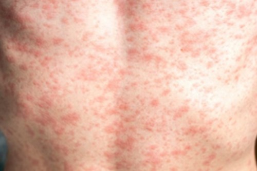 Measles infects the respiratory tract and then spreads throughout the body. Symptoms include a high fever, cough, runny nose and rashes all over the body.