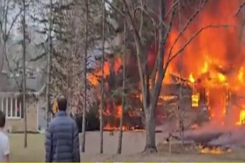 Smoke billowed from the burning home, which stood in the middle of a neighbourhood. The neighboring houses remained untouched by the fire. At least three firefighters were visible, working to extinguish the blaze.