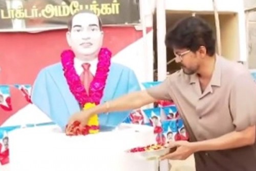 The tribute took place at the Ambedkar statue in Pallavakkam, Chennai, where Vijay offered flowers and garlands as a mark of respect.