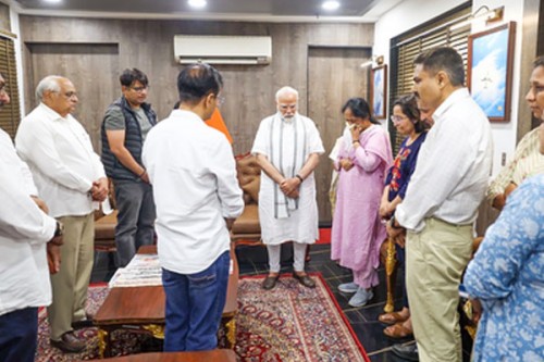 Ahmedabad, June 13 (IANS) Prime Minister Narendra Modi on Friday met the family members of former Gujarat Chief Minister, Vijay Rupani, who was among the 241 passengers who died in the tragic AI-171 plane crash on Thursday, and expressed solidarity with them in their hour of grief.
