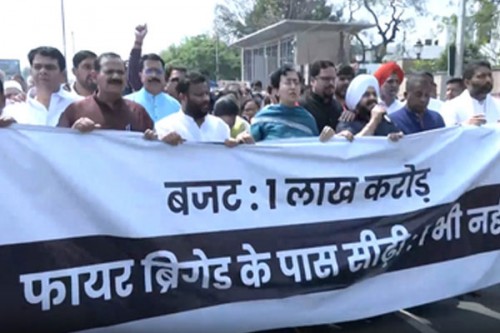 New Delhi, March 24 (IANS) Delhi's Leader of the Opposition Atishi, along with other AAP legislators, staged a protest outside the Assembly on Tuesday, alleging that despite a Rs 1 lakh crore budget, the government has failed to provide even a single ladder for the Fire Department.