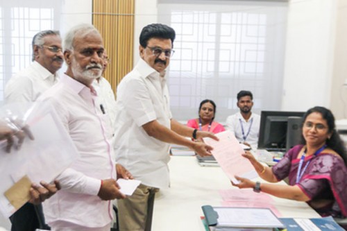 Against this backdrop, Stalin arrived at the designated election office located at Paper Mills Road under the Kolathur Assembly segment and submitted his nomination papers to Returning Officer S. Shanthi in the presence of senior leaders, including Minister Sekhar Babu.