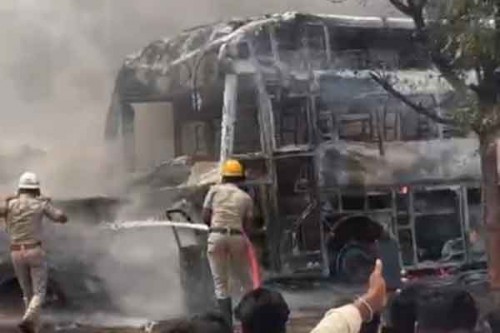 Yadgir (Karnataka), April 17 (IANS) A tragic road accident claimed six lives after a head-on collision between a car and a private bus resulted in a deadly blaze in Yadgir district of Karnataka on Friday.