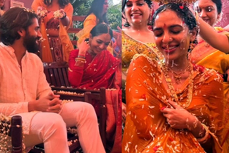 Pictures from the couple’s vibrant Haldi are circulating widely on social media. Naga and Sobhita’s pre-wedding celebrations began with this ritual, attended by their close family members. A video collage featuring the couple dressed in traditional attire for their haldi is doing the rounds on social media.
