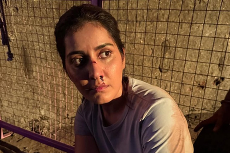 Raashii took to Instagram, where she shared a slew of images. In the photographs, the actress appeared bruised, bloodied, and intensely focused. She could be seen in a simple T-shirt and black pants, with the visible injuries on her nose and hand.