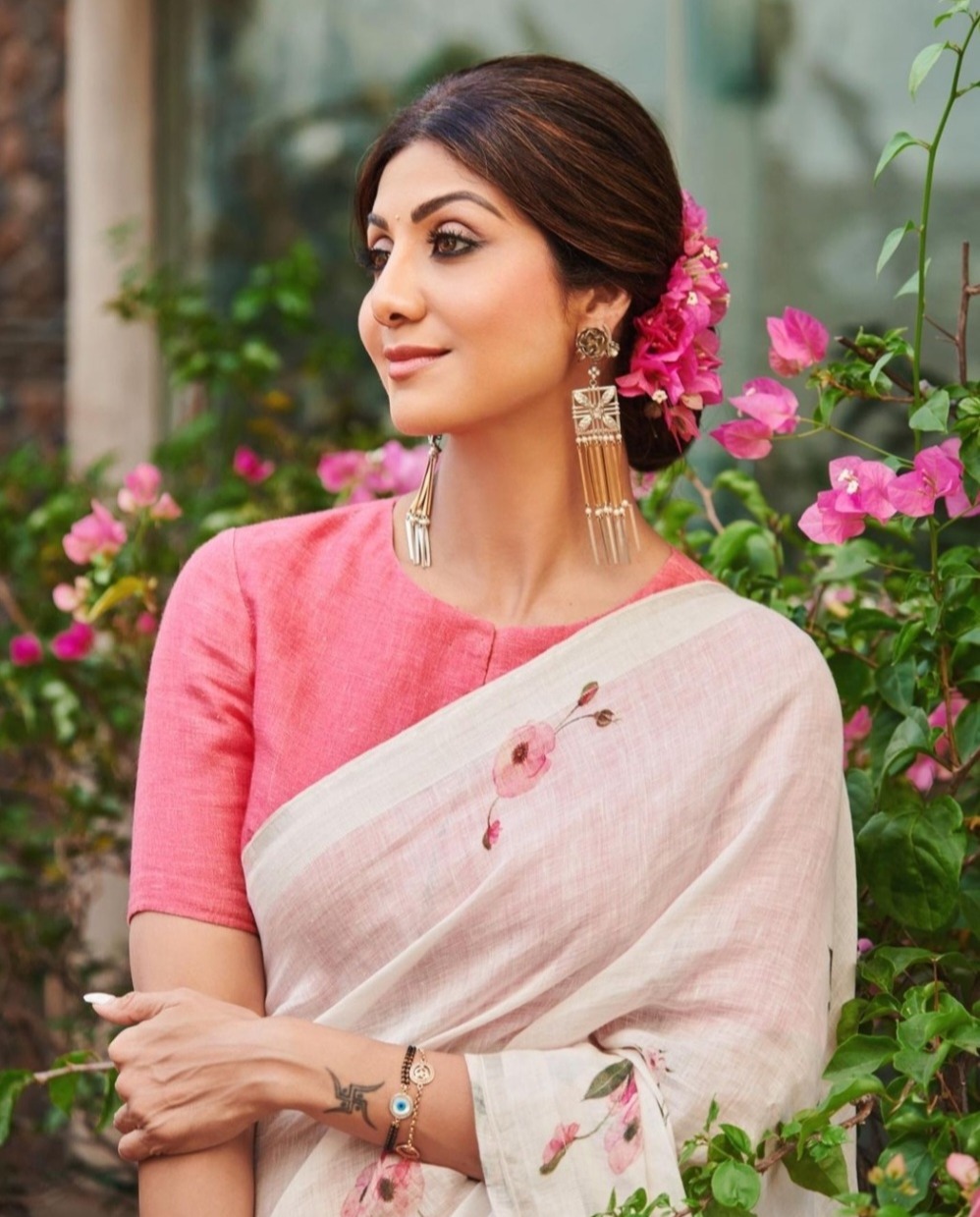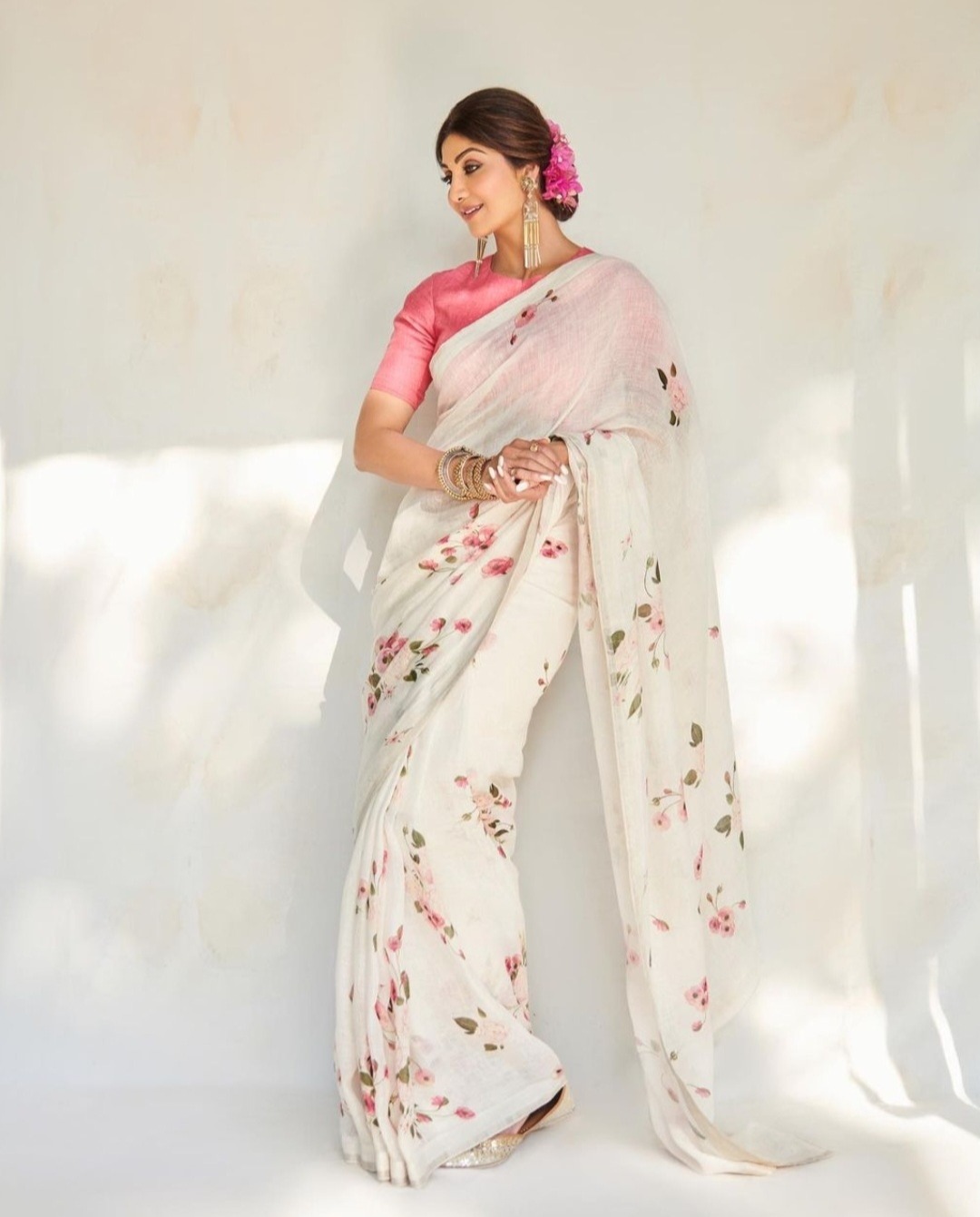 శిల్పాశెట్టి తన సాంప్రదాయ రూపాన్ని ఇన్స్టాగ్రామ్లో షేర్ చేసింది. శిల్పా ఫ్లోరల్ ప్రింట్ చీరలో చాలా అందంగా ఉంది. శిల్పా పింక్ కలర్ బ్లౌజ్తో తెల్లటి చీర కట్టుకుంది. శిల్పా కాటన్ చీరలో చాలా అందంగా ఉంది.శిల్పా తరచుగా తన బోల్డ్ అవతార్ను సోషల్ మీడియాలో పంచుకుంటుంది. కానీ నటి తన సాంప్రదాయ రూపాన్ని ఇంటర్నెట్లో పంచుకోవడం ద్వారా అందరి దృష్టిని కొల్లగొట్టింది. లైట్ మేకప్ మరియు సింపుల్ బన్ హెయిర్స్టైల్లో శిల్పా ఏంజెల్గా కనిపించడం లేదు. ఆమె జుట్టులో పింక్ కలర్ గజ్రా తన అందంలో నలుగురు వెన్నెలని చూస్తోంది.