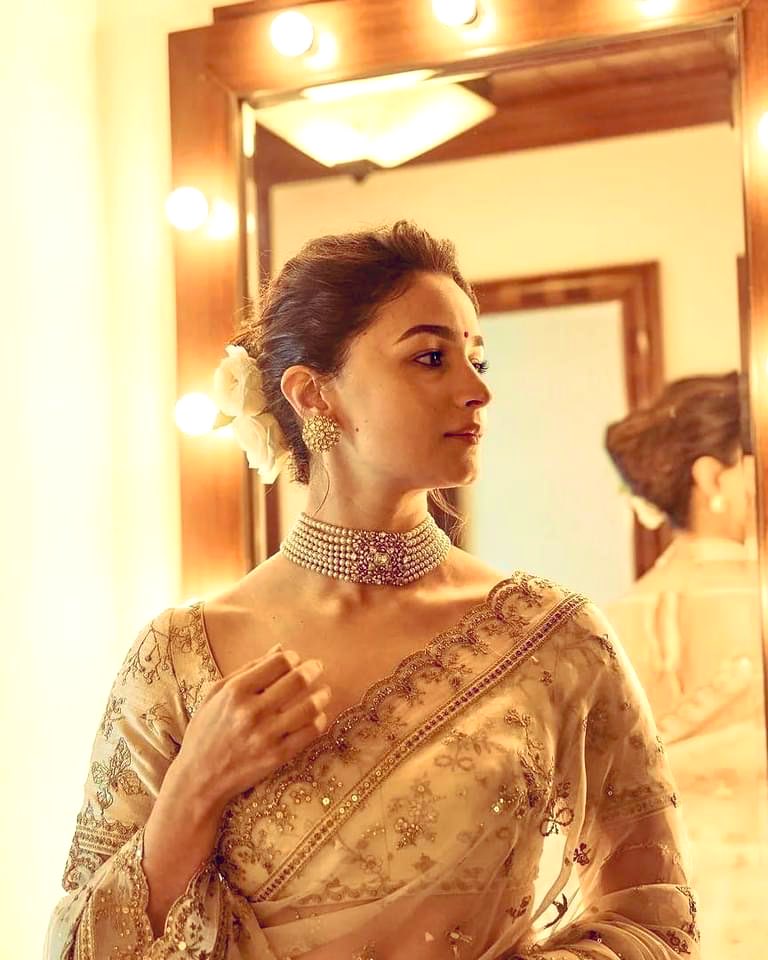 ఇప్పుడు ఆలియా దుస్తులే చర్చనీయాంశంగా మారింది. అలియా లేత గోధుమరంగు రంగు చీర మరియు లైట్ సీక్వెన్స్ వర్క్ మరియు డీప్నెక్ బ్లౌజ్ ధరించింది. ఈ సమయంలో నటి చాలా తక్కువ మేకప్ మరియు నగ్న పెదాలను ఉంచింది. ఆమె తన జుట్టును బన్లో కట్టి, తెల్లటి పువ్వులతో తన జుట్టును అలంకరించుకుంది. ఆమె బంగారు చోకర్ను అనుబంధంగా తయారు చేసింది.అలియా తన పెళ్లి సందర్భంగా కూడా అదే చీరను ధరించిందని మీకు తెలియజేద్దాం. ఆమె మరోసారి ఈ చీరను చాలా అందంగా తీసుకువెళ్లింది.