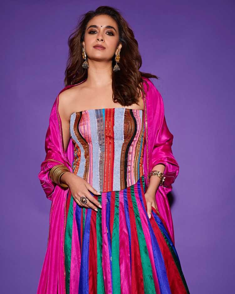 అందాల ముద్దుగుమ్మ కీర్తి సురేష్ గురించి ఎంత చెప్పినా తక్కువే. మహానటి మూవీతో ఈ అమ్మడు ఓవర్ నైట్ స్టార్ హీరోయిన్గా మారిపోయింది. అందం అభినయంతో ఎంతో మంది మదిని దోచేసి, ఈ తరం మహానటిగా తనకంటూ స్పెషల్ ఇమేజ్ క్రియేట్ చేసుకుంది.ఇక ఎప్పుడూ సోషల్ మీడియాలో చాలా యాక్టివ్గా ఉండే ఈ బ్యూటీ తాజాగా, మల్టీ కలర్ డ్రెస్లో అభిమానులను ఆకట్టుకుంది.బ్యూటీ కీర్తి సురేష్ గురించి ప్రత్యేక పరిచయం అవసరం లేదు. రామ్ పోతినేని నేను శైలజా తో ఈ ముద్దుగుమ్మ టాలీవుడ్ లోకి ఎంట్రీ ఇచ్చింది. ఈ తో మంచి ఫేమ్ సంపాదించుకొని, అనతికాలంలోనే ఈ ముద్దుగుమ్మ స్టార్ నటిగా తన సత్తా చాటుకుంది. వరసగా స్టార్ హీరోల సరసన నటించి మంచి క్రేజ్ సొంతం చేసుకుంది.ఈ బ్యూటీ తెలుగులో అగ్రహీరోలందరి ల్లో నటించి మంచి ఫేమ్ సంపాదించుకున్న విషయ తెలిసిందే. ఇక ప్రస్తుతం ఈ అమ్మడుకు తెలుగులో అవకాశాలు తగ్గడంతో ఈ ముద్దుగుమ్మ బాలీవుడ్ చెక్కేసి, అక్కడ వరసగా లు చేస్తూ ఫుల్ బిజీ అయిపోయింది. బేబీజాన్ తో బాలీవుడ్ ప్రేక్షకులను పలకరించిన ఈ బ్యూటీ, బాలీవుడ్ లోనే మరో ప్రాజెక్ట్ కూడా సైన్ చేసినట్లు తెలుస్తుంది.ఇక ఇదిలా ఉంటే ఈ బ్యూటీ తన చిన్ననాటి స్నేహితుడు ఆంటోని థట్టిల్ ను డిసెంబర్ 12,2024లో బంధుమిత్రుల సమక్షంలో పెళ్లి చేసుకున్న విషయం తెలిసిందే. ఇక పెళ్లి తర్వాత ఈ బ్యూటీ గ్లామర్ మరింత పెంచిందనే చెప్పాలి. ఎందుకంటే ఈ మధ్య ఈ అమ్మడు తన అంద చందాలతో సోషల్ మీడియాలో తెగ హల్ చల్ చేస్తుంది.